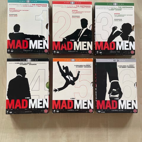 Mad Men Sæson 1-3 DVD sæt indeholder de første tre sæsoner af tv-serien Mad Men. Sættet inkluderer DVD'er med episoder fra sæson 1, 2 og 3, præsenteret i original emballage med coverbilleder og beskrivelse på bagsiden.