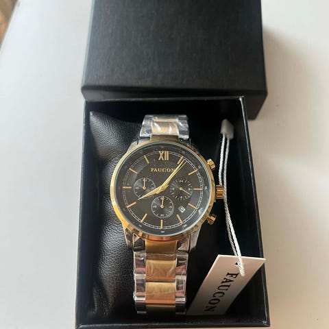 Faucon Chrono F10011 skiller sig ud med sin runde urkasse og en kontrasterende guld bezel, der omkranser en mørk urskive. Dette ur er designet med tre kronografer, der tilføjer dybde og funktionalitet til dets udseende. Slanke timemarkører og elegante visere forbedrer dets klassiske look, mens en datovisning tilbyder ekstra praktisk anvendelighed. Den tofarvede lænke, med skiftende guld- og sølvled, komplementerer det samlede design, sikret med en butterfly lås for nem brug.