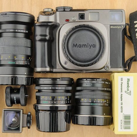 Der er 4 kassetter, planfilm-holder 3 optikker Mamiya Sekor 150mm 5,6, 90mm 3,5, 65mm 6,3 med søger og original Mamiya beredskabstaske. Alt i rigtig god stand uden alvorlige skrammer. Det er et målsøger-kamera og kan også bruges til arkitektur idet der er lidt muligheder for opretning af styrtende linjer samt ekstra udtræk til macro. Kan også bruges til 6X9 planfilm og der medfølger matskive som på et teknisk kamera.