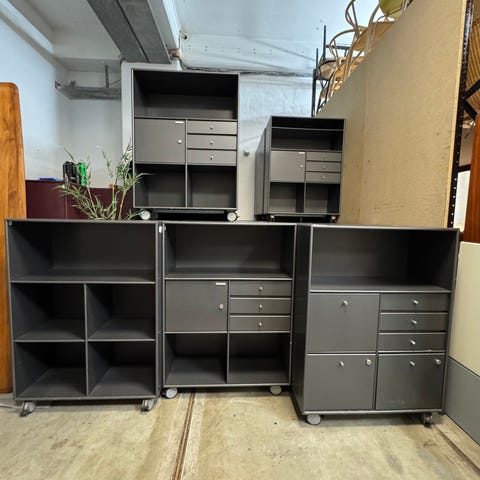 Stort parti grå Montana moduler, super flot og elegant udtryk -med låger, skuffer og hylder som kan rykkes rundt alt efter behov.