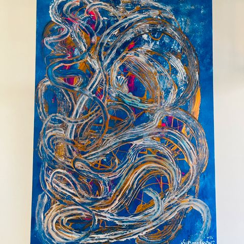 Abstrakt kunstmaleri med blå og grå farvetoner. Maleriet indeholder forskellige geometriske former og strukturer, hvilket giver en moderne og kunstnerisk udtryk. Velegnet til indretning i hjem eller kontor.