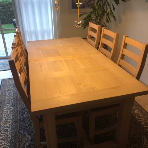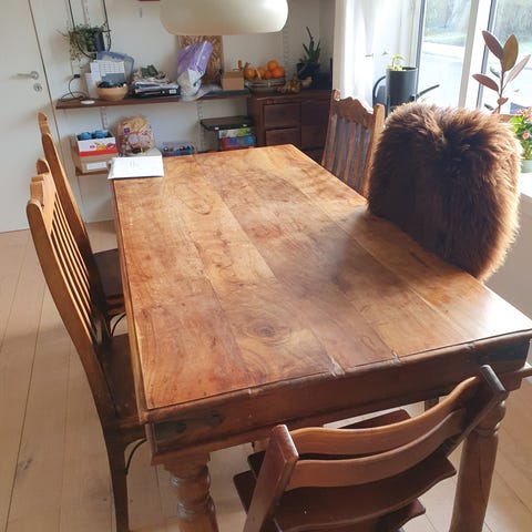 Flot rustikt træbord med læderstole til. Købt hos Trademark Living. Rigtig god sidde komfort.