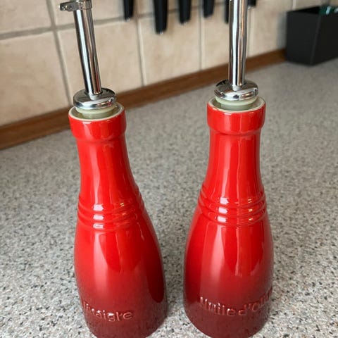 Le Creuset Oliekande og eddikeflaske rød keramik