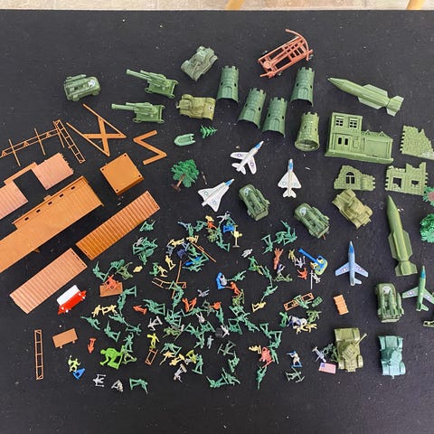 Kasse med myresoldater. Soldater og indianer, med lidt tilbehør. Ukendt mærke