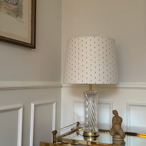 Smuk vintage standerlampe i messing med cremefarvet stofledning og håndlavet skærm i Helene Blanche Emerald Drop.