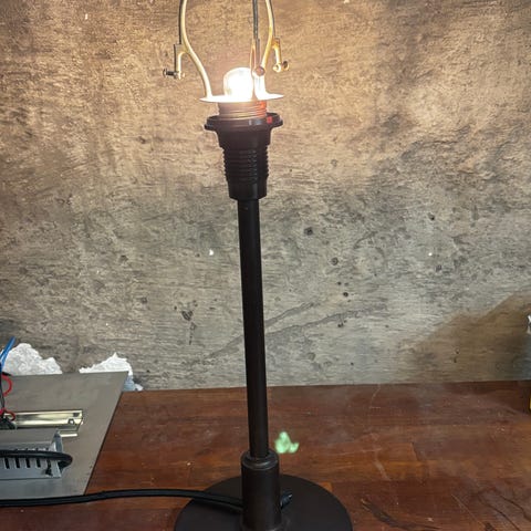 Lampen har et karakteristisk skærmdesign, der fordeler lyset effektivt. Velegnet til brug som bordlampe i forskellige rum.