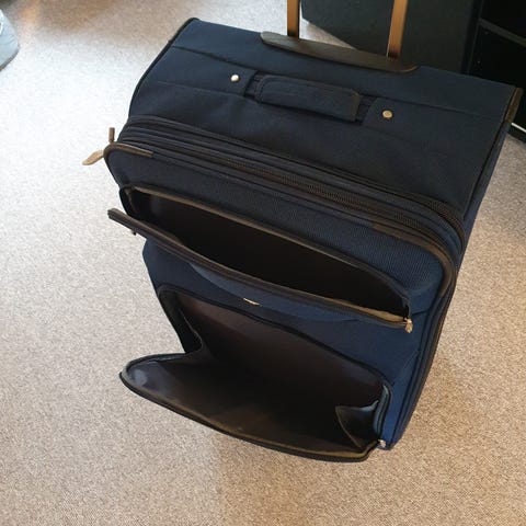 stof kuffert mærket Tripp unisex taske. Tasken er lavet af stofmateriale og er designet til brug af både mænd og kvinder. Den har en rummelig indvendig del, der åbnes med lynlås, og er udstyret med hjul for nem transport.