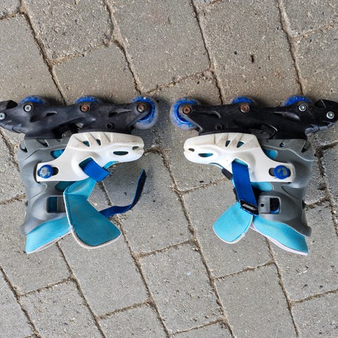 Rulleskøjter til børn i størrelse 35 med blå og sort farve. Designet til rulleskøjteløb med justerbare stropper og hjul under støvlen.
