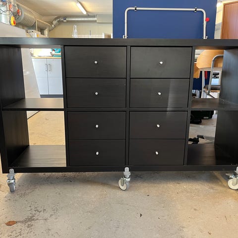 Sort reol med hjul, med hylde. Den har hjul, hvilket gør den nem at flytte rundt på. Reolen viser tegn på brug med mindre skrammer og slid på overfladen.