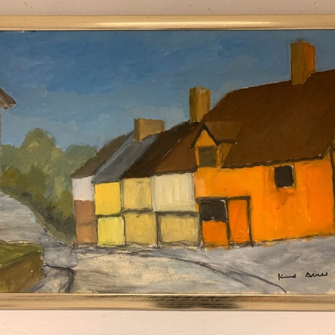Smukt Harald Leth maleri med motiv af et hus i naturen, udført i kunstnerens karakteristiske stil med klare farver, levende penselstrøg og poetisk stemning. Et harmonisk og farverigt værk, hvor landskabet og bygningen smelter sammen i et naturligt og roligt udtryk – typisk for Leths sans for lys, natur og komposition.