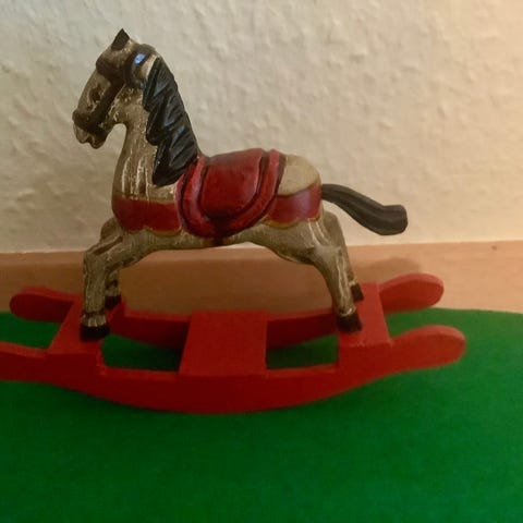 Gyngestol hest dekorationsfigur i træ med beige og sølv nuancer. Velegnet til dekoration ved andre højtider.
