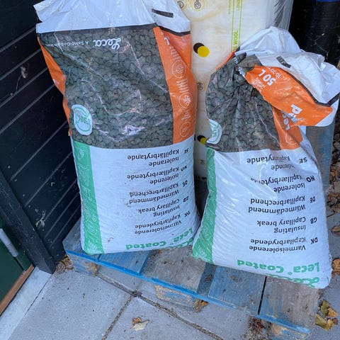 Leca kugler sten. Kan bruges til have krukker eller til varmeisolering. Ca 65 liter. En uåbnet sæk plus ca 20 liter .