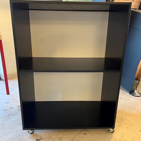 Sort reol med 8 skuffer og åbne hylder på hjul. Reolen har en praktisk opbevaringsløsning med både lukkede skuffer og åbne rum, hvilket gør den velegnet til opbevaring og organisering i forskellige rum. Hjulene gør reolen nem at flytte rundt på.