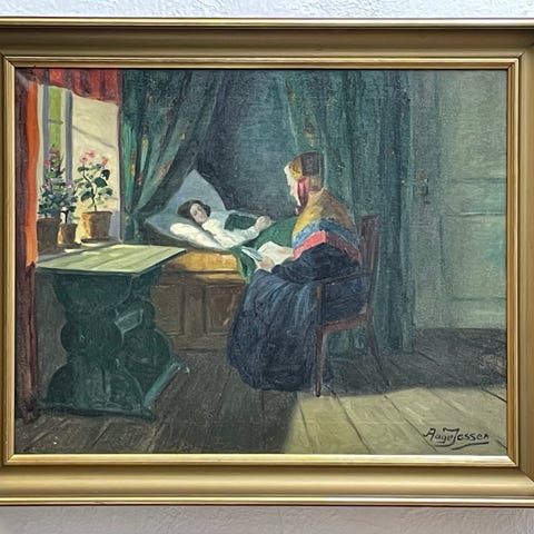 Maleriet fremstår både poetisk og dekorativt og passer perfekt som kunstnerisk blikfang i stue, entré eller soveværelse. Et flot værk for samlere af dansk figurativ kunst eller til dig, der ønsker et maleri med dybde, varme og personlighed.
