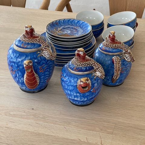 Sættet inkluderer 4 tallerkener, 4 tekopper og 4 underkopper, 1 tekande m. låg, 1 mælkekande og 1 sukkerskål med låg