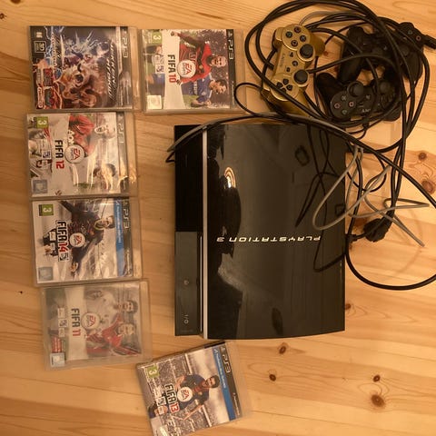 PlayStation 2,3 og 4 med diverse tilbehør og spil.