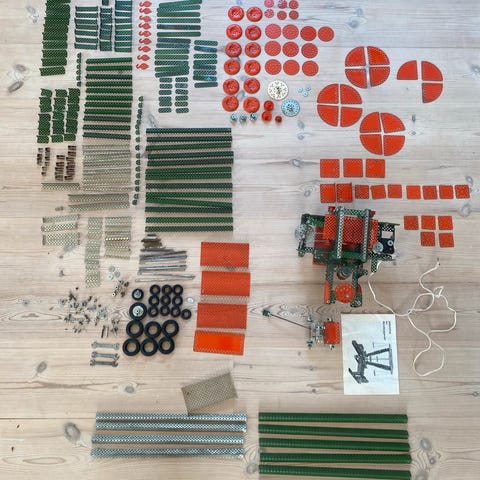 En kasse med en masse metal constuction dele