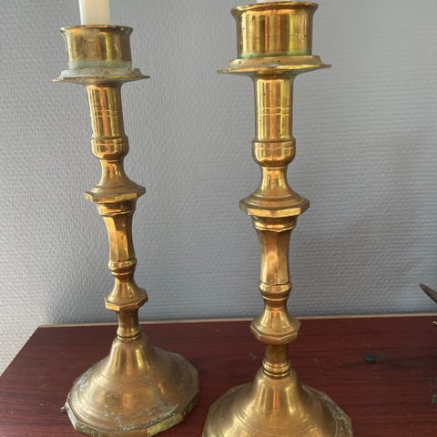 2 rigtig flotte ældre lysestager, måler 29 bred og 23 cm høj. Kan evt pudses op hvis man ønsker et andet udtryk. Prisen er samlet for begge stager. Vejer 1,8 kg pr stk.