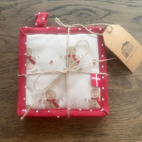 Håndlavede og dobbelte grydelapper. Rent bomuld. Ca 20x20. Fra røg- og dyrefrit hjem. Kan tåle meget varme. Måske en værtindegave?