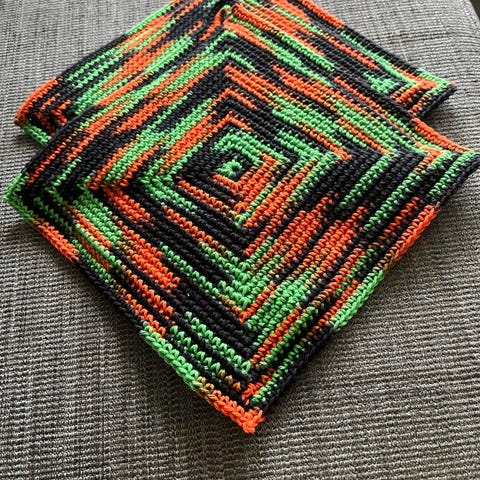 Håndlavede dobbelte grydelapper i rent bomuld. Fra røg- og dyrefrit hjem. Kan tåle meget varme. Meget populære og holdbare.