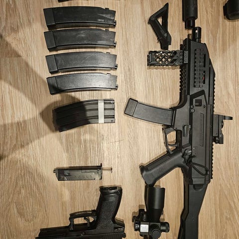- scorpion evo, med 5 magasiner, sigtekorn og tracer. Samt batteriet der til og oplader