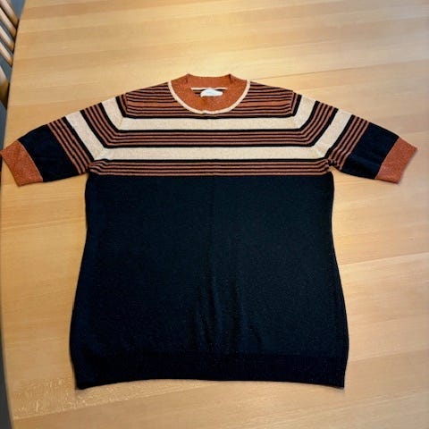 Nümph Bluse i chokoladebrun farve med en fin sort streg, størrelse XL og med et brystmål på cirka 88 cm, når den ligger på bordet, ginen har et brystmål på cirka 104 cm. Længden på blusen er cirka 62 cm. Blusen er lavet af 70% viskose og 30% polyamid. Blusen har lange ærmer og bemærk på billede 3, hvor fint den sorte streg passer fra selve blusen over i ærmet. Det er altid svært at få den rigtige farve frem på billederne. Her er den reelle farve bedst på billede 5. Blusen er helt ny og ubrugt.