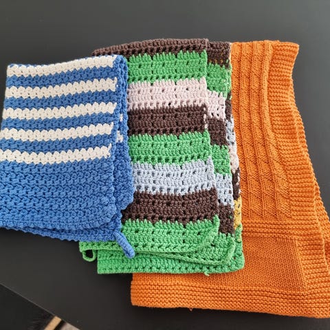 Håndlavede hæklede grydelapper lavet af bomuld i farverne gul og grøn. Designet med firkantede mønstre og små løkker til ophængning. Velegnet til beskyttelse mod varme i køkkenet. Ca 20x20. Fra røg- og dyrefrit hjem. Se også gerne mine andre annoncer.