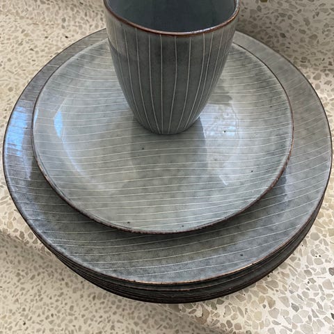 En skål, 3 tallerkener, der måler 14,5 cm. Den ene har et afslag og lidt forskellige krus fra Broste. De koster 20 kr per styk. Jeg sender ikke