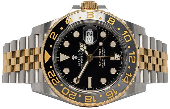Den blå skive med gyldne visere og timemarkeringer giver et smukt spil mellem farver og materialer, mens den drejelige guldkrans tilfører et eksklusivt præg. Datovisningen kl. 3 med cyclops-linse sikrer tydelig læsbarhed – et klassisk kendetegn for Rolex.