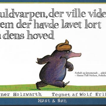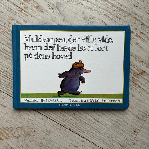 Ill. i farver - Originaltitler: Billedbog om en hanbjørn, som gerne vil være far. Men hvordan får man børn? Han får gode råd af andre dyr, men det virker ikke. Heldigvis møder han en dejlig hunbjørn... - Udgivet i forbindelse med 20-års jubilæet for udgivelsen af ""Muldvarpen, der ville vide, hvem der havde lavet lort på dens hoved""
