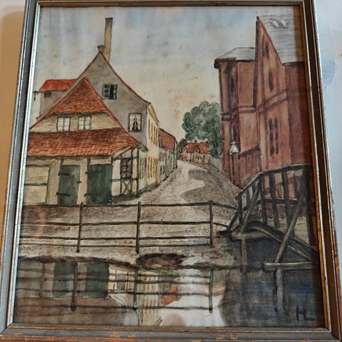 Akvarel af Amalfi-katedralen, signeret Starke, ca. 1880–1900. Fint detaljeret italiensk gade- og kirketal. Original ældre ramme med patina. Akvarellen er håndmalet (ikke tryk) og monteret på lærred som typisk for perioden. Mål inkl. ramme ca. 65x48