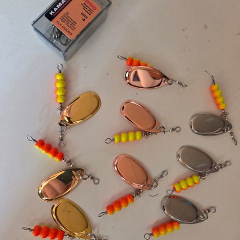 Sæt af forskellige fiskegrej med spinnerblade i forskellige farver og størrelser. Egnet til laksefiskeri -21g