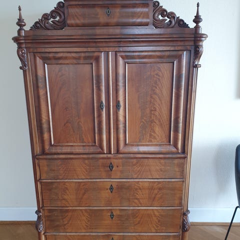Smukt antikt chatol med skriveklap og vitrineskab.