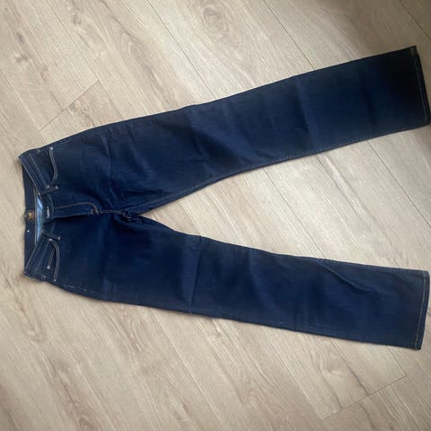 Lee Jane straight legdamejeans i blå denim. Størrelse L med taljemål W31 / L34. Jeansene er fremstillet i denimmateriale og designet til kvinder.