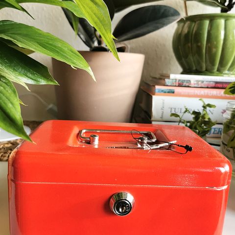 Pengekasse i flot retro orange , velbevaret