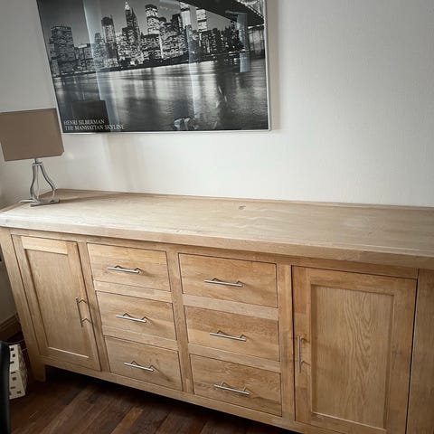 Bordpladen måler D46xB162, og skænken derunder måler D44xB150. (Bordpladen i sig selv har stor værdi!)