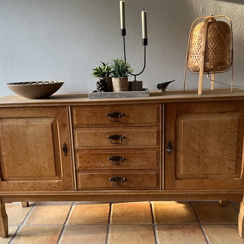 Retro skænk i massiv egetræ og i solid snedker-kvalitet. Trænger til let slibning (særligt bordpladen - se billeder), men fejler ellers intet. Virkelig flot håndværk.