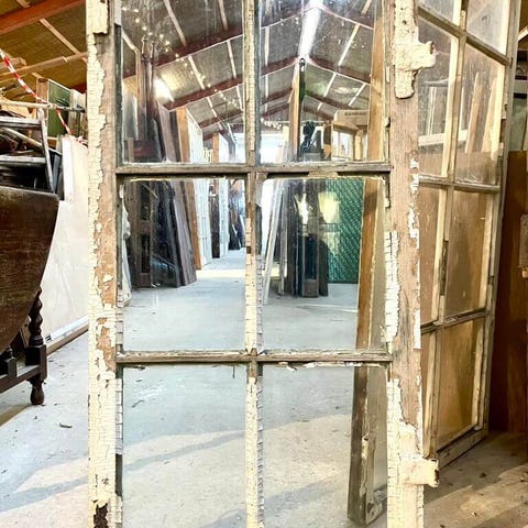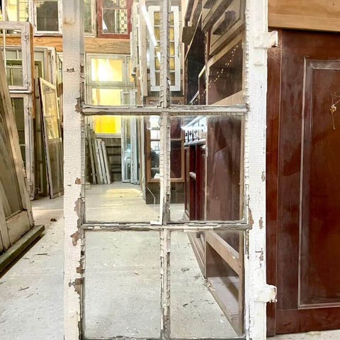 Klassisk 6-ruders vinduesramme i kernetræ. Stammer fra Den Spanske Ambassade i København, hvor de desværre ikke har været korrekt vedligeholdt. Fremstår derfor med afskallende maling samt løs/manglende kit. Dog med sundt træværk.