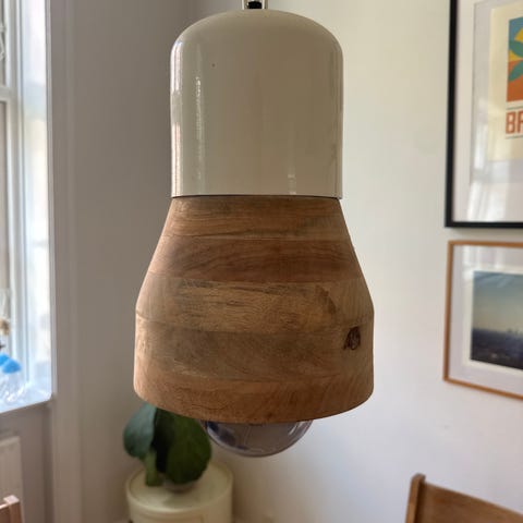 Anden loftslampe, ukendt, Unik loftslampe af træ og jern.Tilhørende træskib i skinne. Skærme med landskabsmotiver. De trænger til at strammes i syningen og lampen trænger til at rengøres.