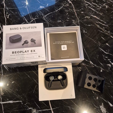 Bang & Olufsen Beoplay EX trådløse øretelefoner med aktiv støjreduktion. Inkluderer opladningsetui. Designet til at levere høj lydkvalitet og komfort til brug i forskellige miljøer. Uåbnet og derfor ikke billede af selve øretelefonerne.