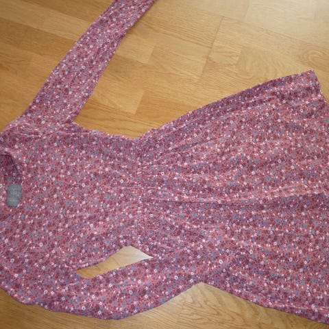 Multifarvet kjole til pige i størrelse 152. Kjolen har et blomster mønster med forskellige farver, og den er fremstillet i bomuldsmateriale, hvilket giver komfort og åndbarhed.
