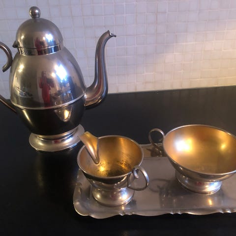 Cathrineholm Cathedral Snack Sæt består af tre skåle med en diameter på 10 cm, lavet af rustfrit stål med teaktræsfad. Sættet har en blå-hvid-sort farvekombination og er designet til servering af snacks.
