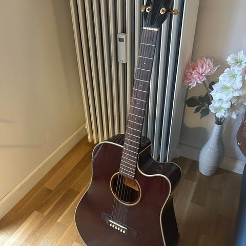 Guitaren sælges billigt da lidt af lakken er røget af nederst på halsen (se billedet). Dette påvirker dog hverken lyd eller duelighed, udelukkende æstetikken.