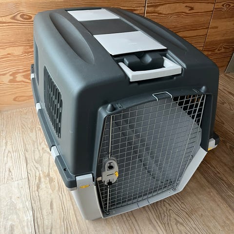 Burets konstruktion er robust med hjørnebeslag i sort plast og metalramme. Egnet til transport af kæledyr. Farven er sølv/grå. Tydelige brugsspor (se billeder), men virker efter hensigten.