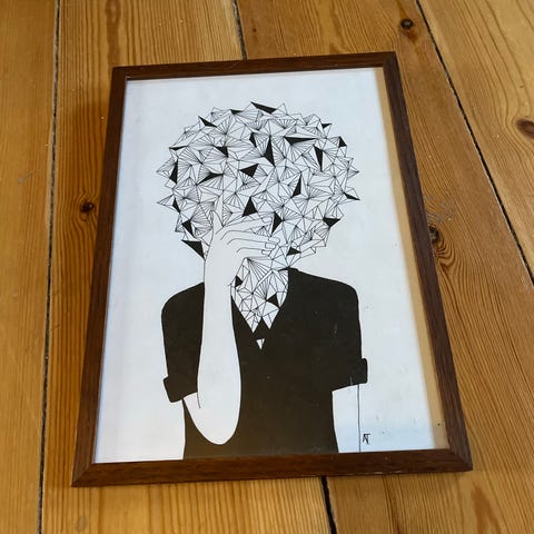 Træramme med et geometrisk mønster i brune og beige nuancer. Rammen har en naturlig træfarve og er udstyret med ophæng bagpå. Velegnet til vægophæng.