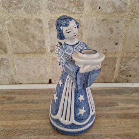 L. Hjorth keramik engel med sjælden grøn glasur der holder et lille stearinlys.