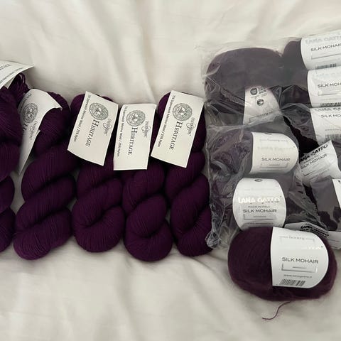 Bestående af flere farver fra forskellige håndfarvere. I nuancer af beige, brun, gul, sort og hvid. Jeg bruger selv 300-350g til en bluse. Kan kombineres med følgetråd af mohair eller lign.