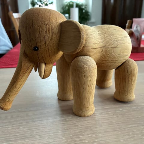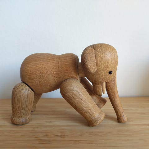 Lille Elefant i Ubehandlet egtræ med bevægelige ben. Højde 13 cm