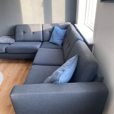 Hjørnesofa med chaiselong, brugt i mange år, men fungere godt til mange personer. Tydelige brugsspor i form af lidt misfarvning nogle steder, men fejler intet ellers. Skilles ad i 3 dele. Der er løse puder.