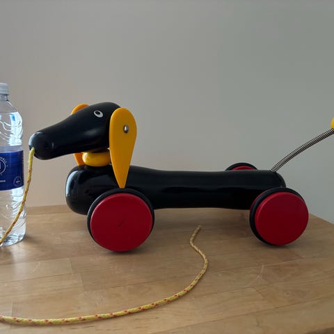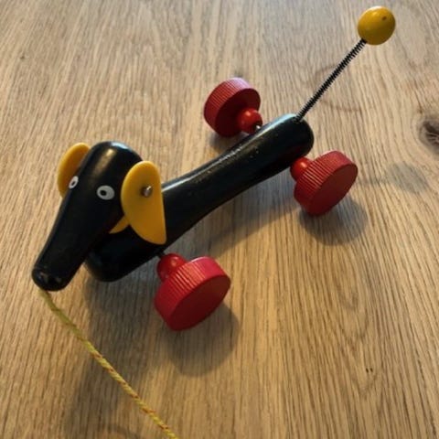 Rød Brio hund. Ikke brugt meget - ses på hjulene. Længde 15,5 cm. vægt 90 gr. Lille mærke på den ene side - se foto